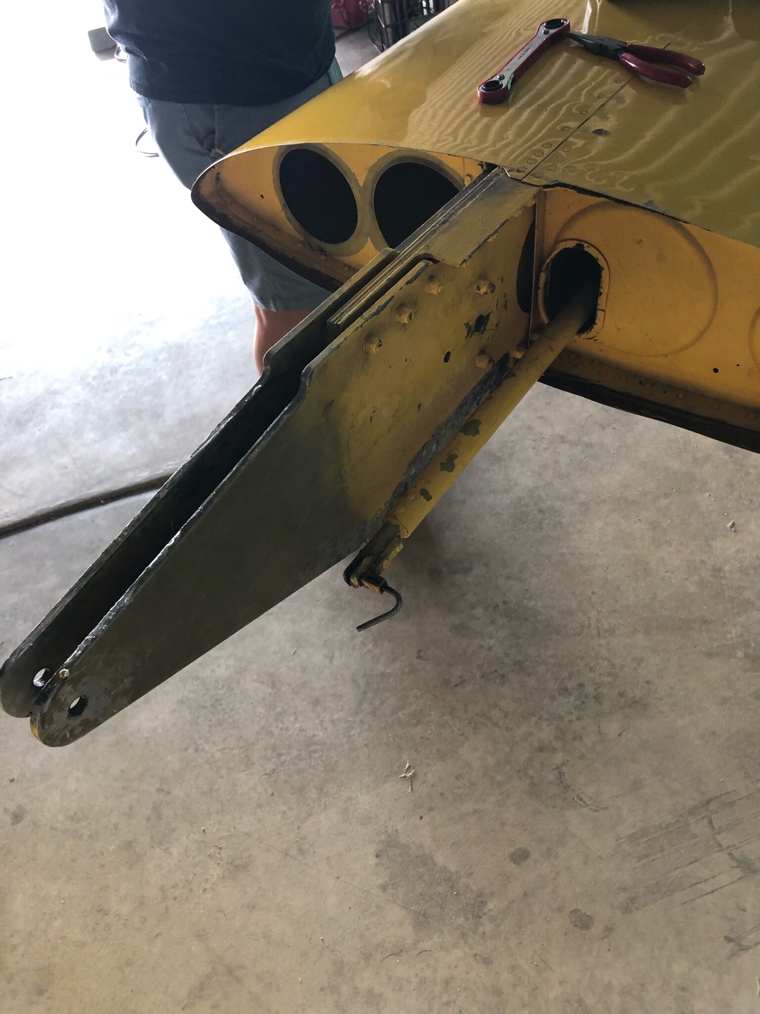 No flying on this beautiful Wednesday. All attention was paid to maintenance on the 1-34. Mark Martin, Chris Varvarosky, and Nick Hoffmann took the wings off of School Bus to diagnose the slight fore-aft play that has been reported. The rear carry though was found to have more in play than usual and was shimmed up on both sides. The wings were reattached and the play was noticeably reduced.